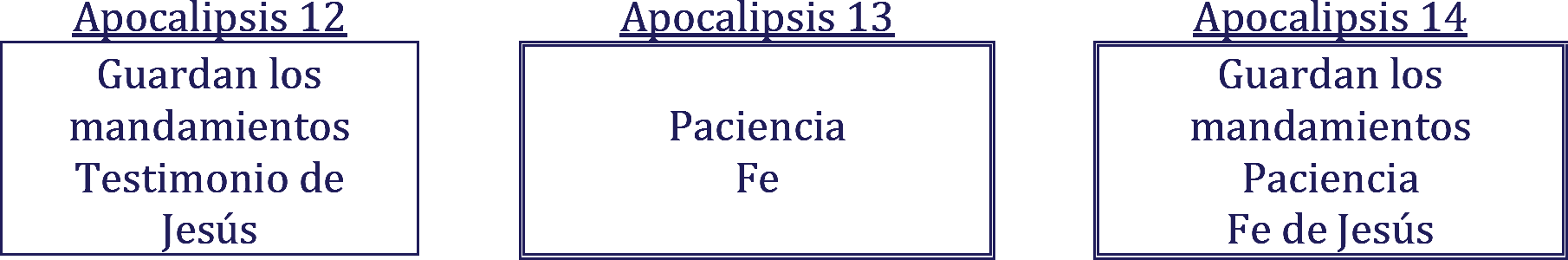 Apocalipsis 12: 17; 13: 10; y 14: 12 son entretejidos y describen las características principales del remanente apareciendo bajo diferentes nombres.